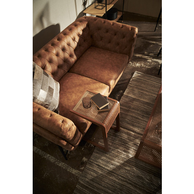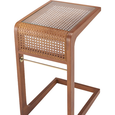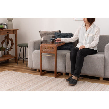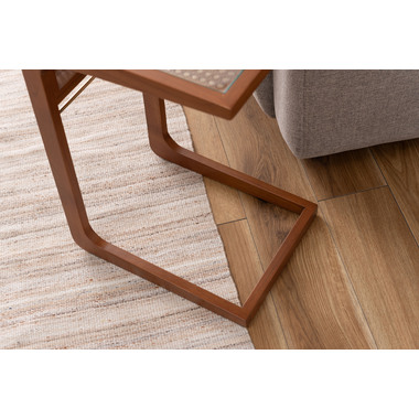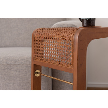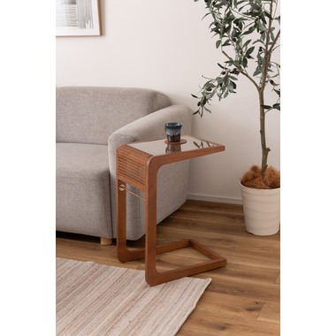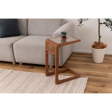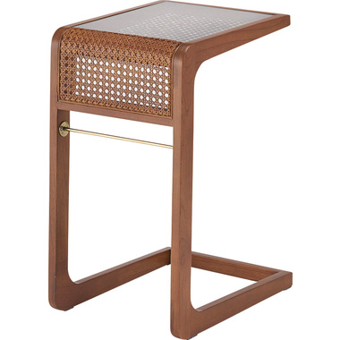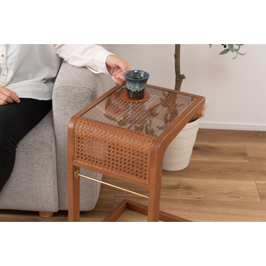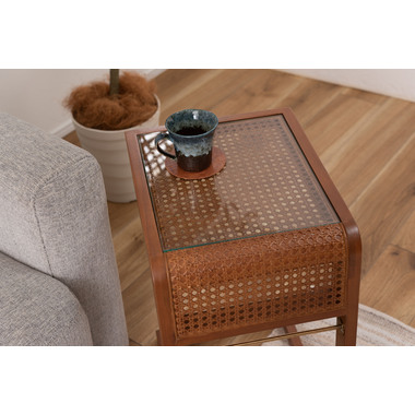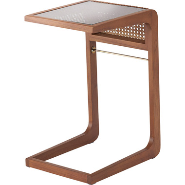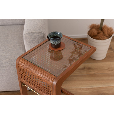 天然ラタンで編まれたメッシュを全体にあしらったガラステーブルシリーズ。カゴメ格子という伝統的な編み方は程よい抜け感と軽量な設計も魅力です。落ち着いた印象のブラウンカラーは様々なシーンによく合います。●丸みを帯びたディティール●ソファサイドでも使いやすい設計