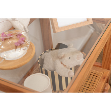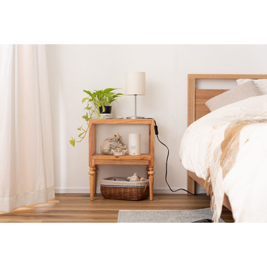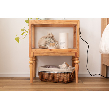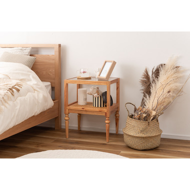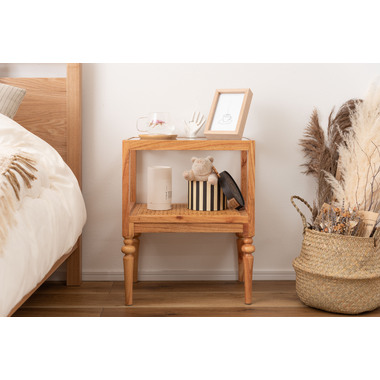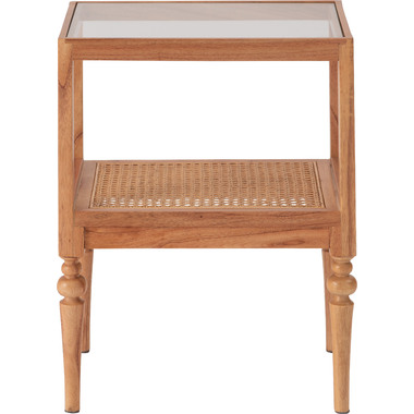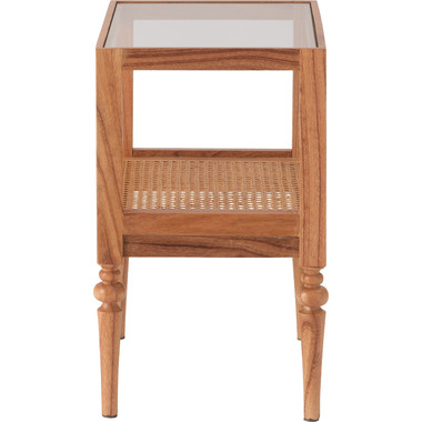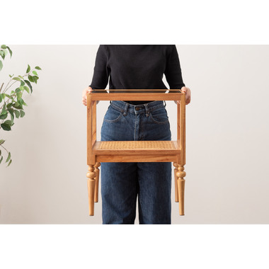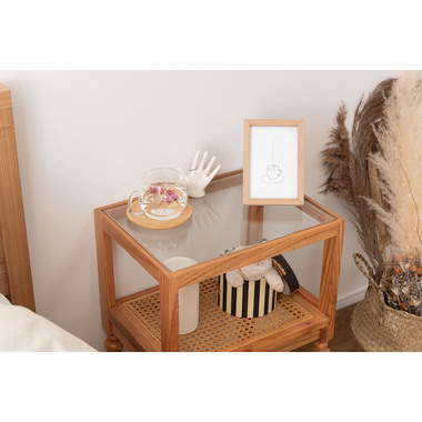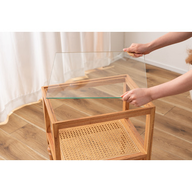 天然木とラタンを使用したナチュラルなイメージのデザインながら、ターンドレッグ(ろくろ脚)を採用することで、クラシカルな雰囲気も感じられるオープンシェルフ&サイドテーブル。ガラス天板で抜け感もあり、使いやすいサイズ感も魅力です。
