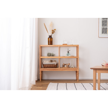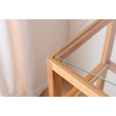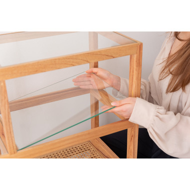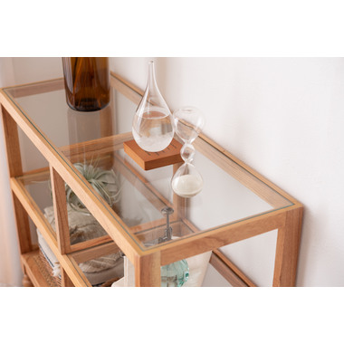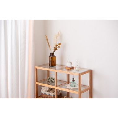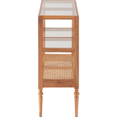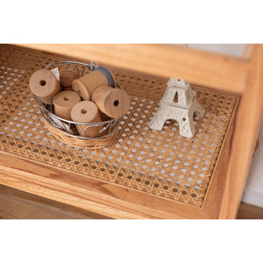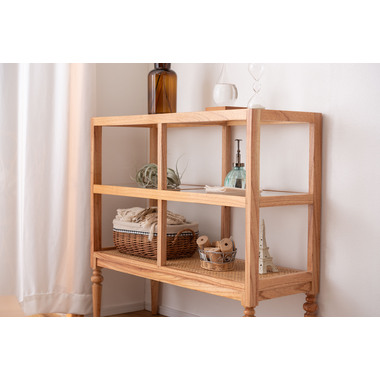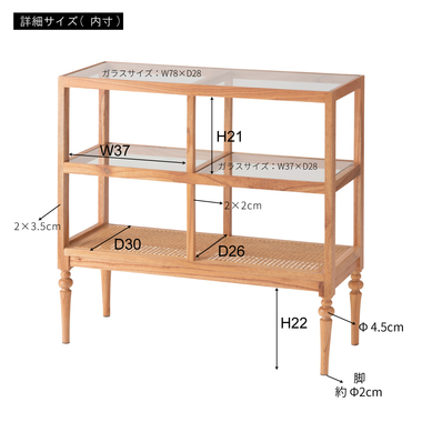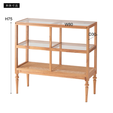 天然木とラタンを使用したナチュラルなイメージのデザインながら、ターンドレッグ(ろくろ脚)を採用することで、クラシカルな雰囲気も感じられるオープンシェルフ&サイドテーブル。ガラス天板で抜け感もあり、使いやすいサイズ感も魅力です。