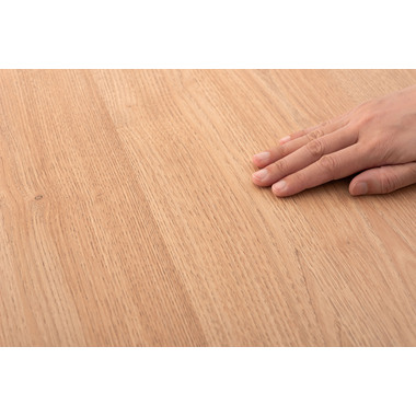 ●シンプルなデザインながら目を引く、木目調の天板は空間の雰囲気を高めるアクセントに。