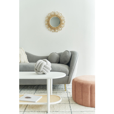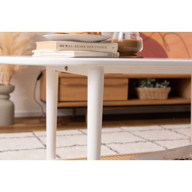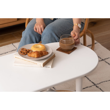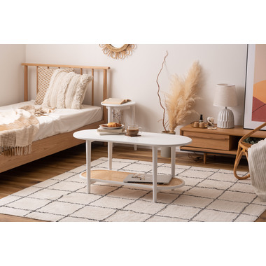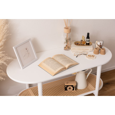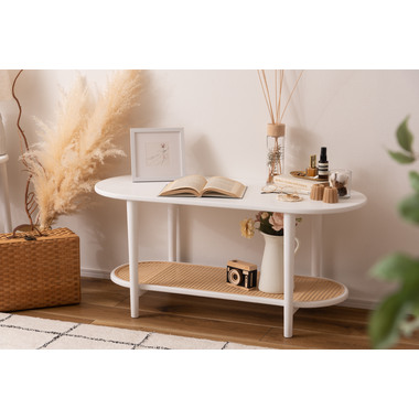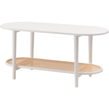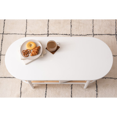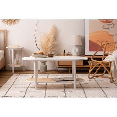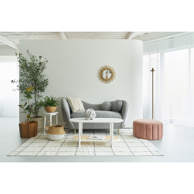 ●ポリプロピレン素材のラタン調デザインが目を引く丸みを帯びたフォルムのテーブルは、クールなイメージにもガーリーなイメージにもマッチするデザイン。