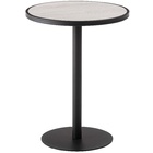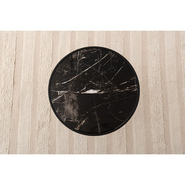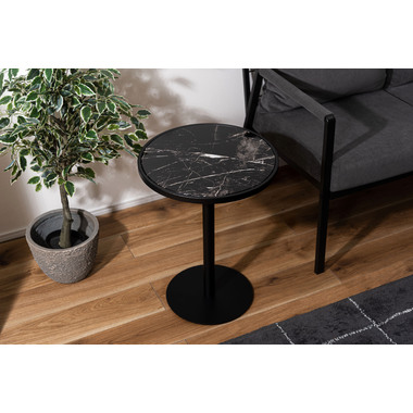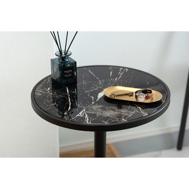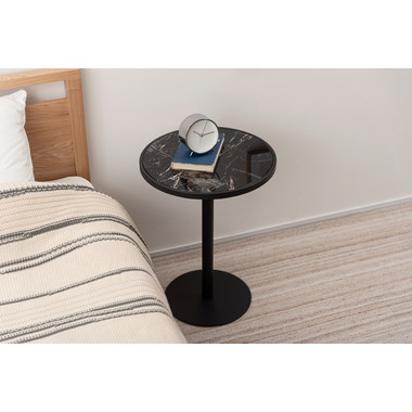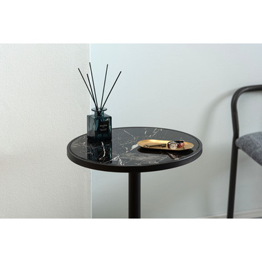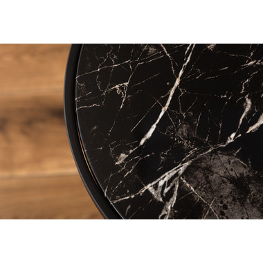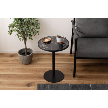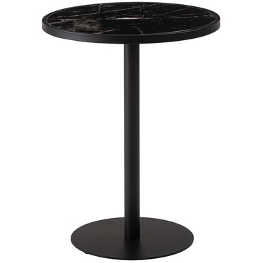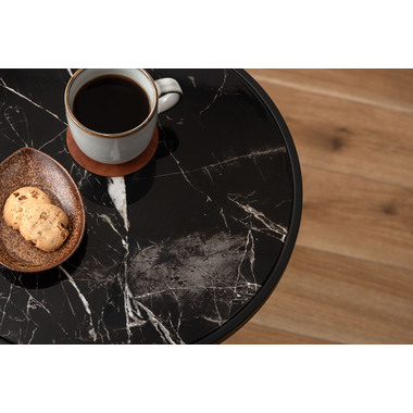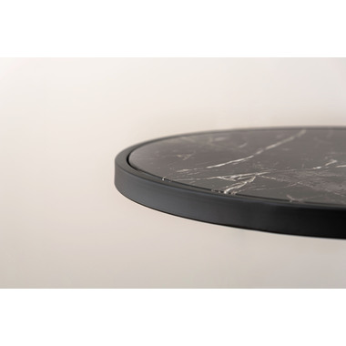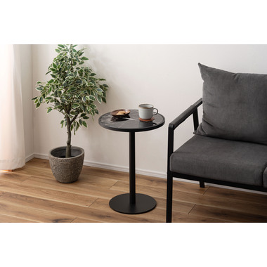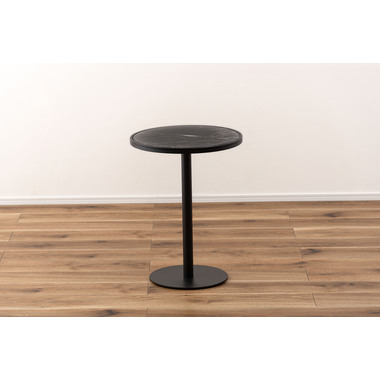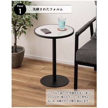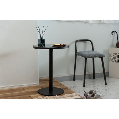●ブラックスチールの脚が凛とした印象を与え、艶やかな石目調の天板が空間に深みを添えます。