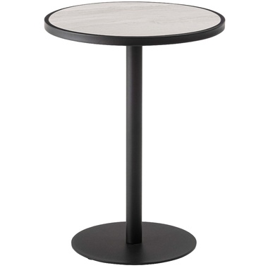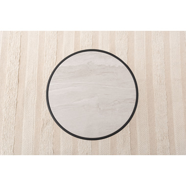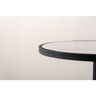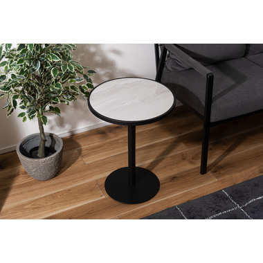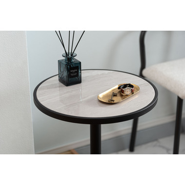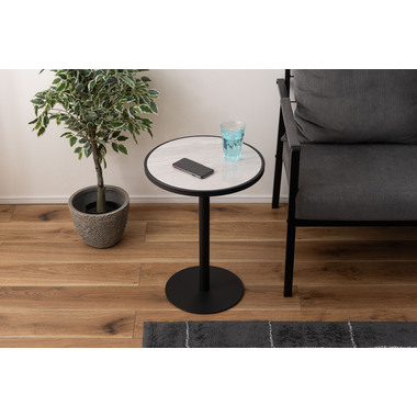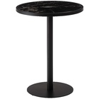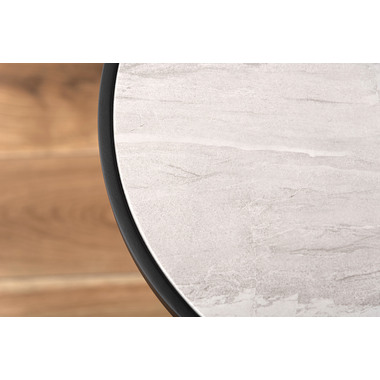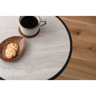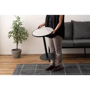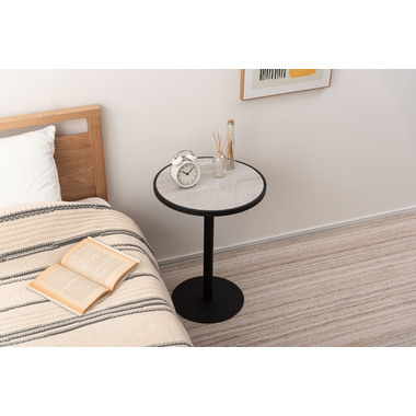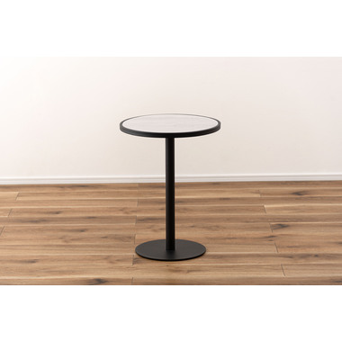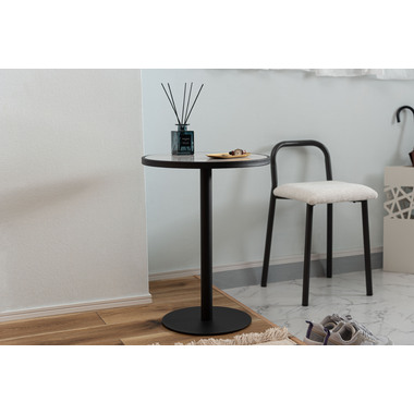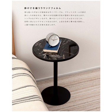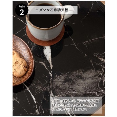●ブラックスチールの脚が凛とした印象を与え、艶やかな石目調の天板が空間に深みを添えます。