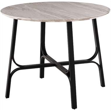 美しい石目調の天板と、繊細なカーブを描くスチール脚が印象的なラウンドテーブル。