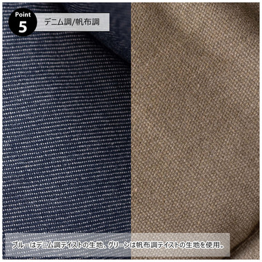 ●ブルーはデニム調テイストの生地、グリーンは帆布調テイストの生地を使用。