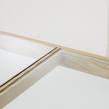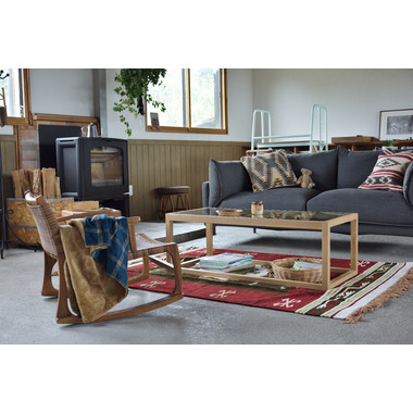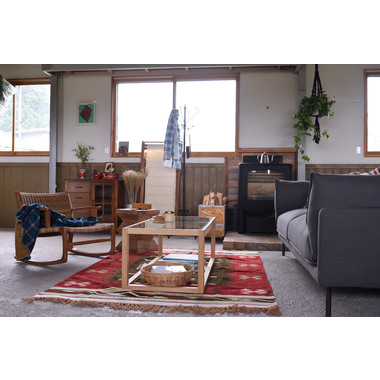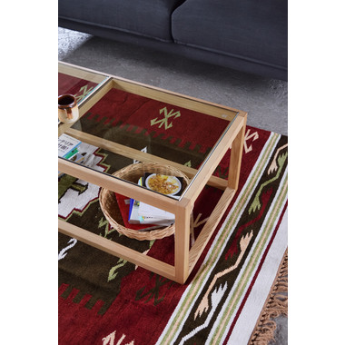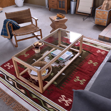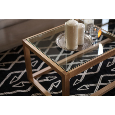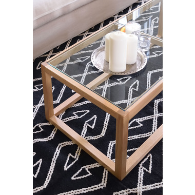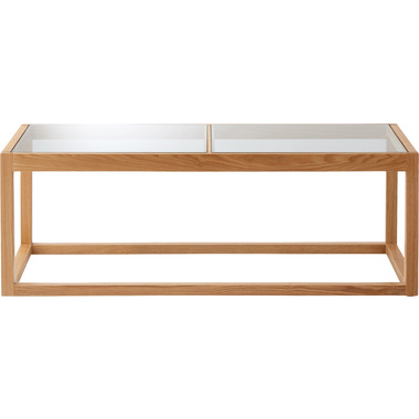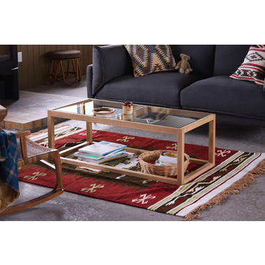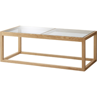 クリアガラス天板とアッシュ天然木を組み合わせたリビングテーブル。スクエアなデザインと視界を遮らないガラス天板は、圧迫感なく空間をスタイリッシュに演出します。