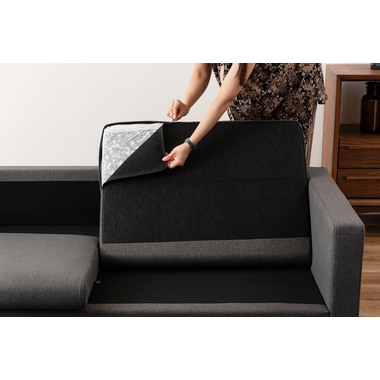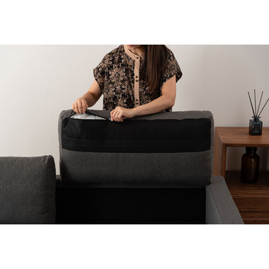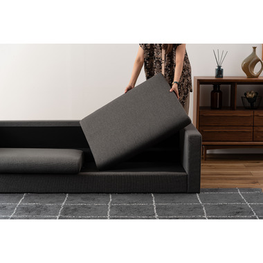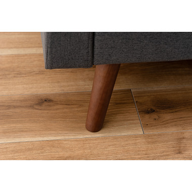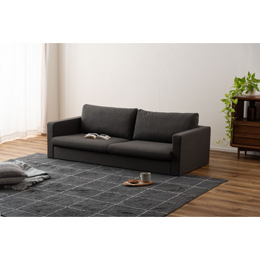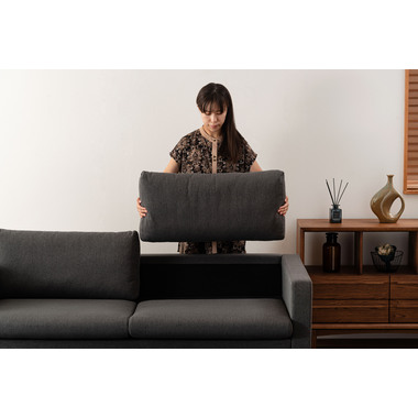 直線的で洗練されたフォルムとファブリックが調和し、様々なインテリアになじみます。脚部はナチュラルとブラウンから選べ、脚を付けずにローソファスタイルとしても使用できます。空間や好みに合わせて楽しめるデザインなので、モダンで上品な空間を演出します。