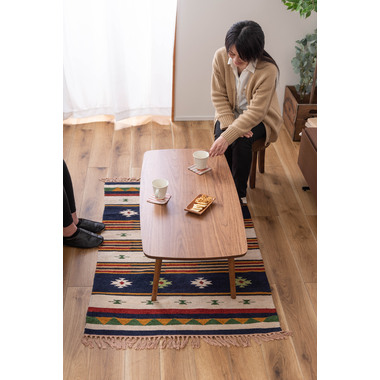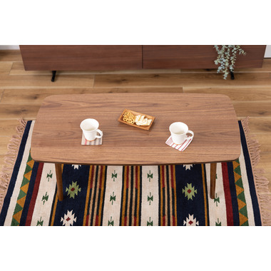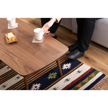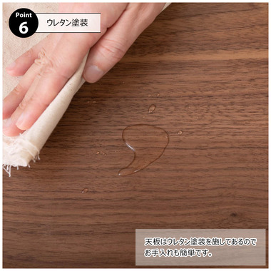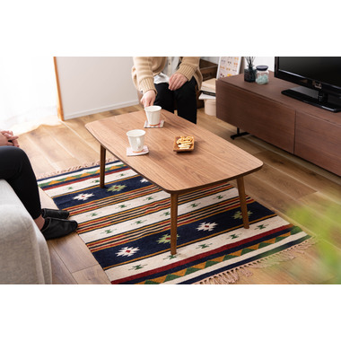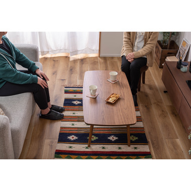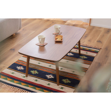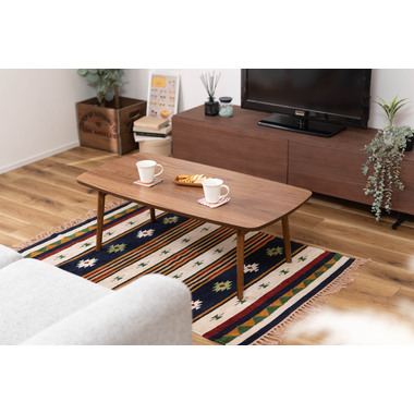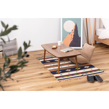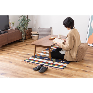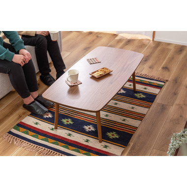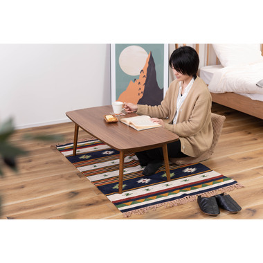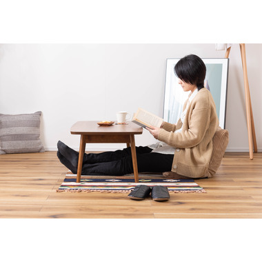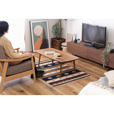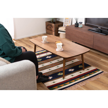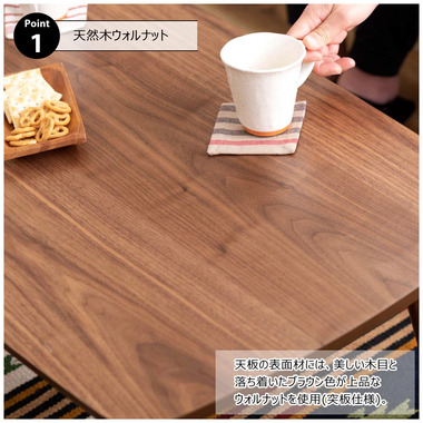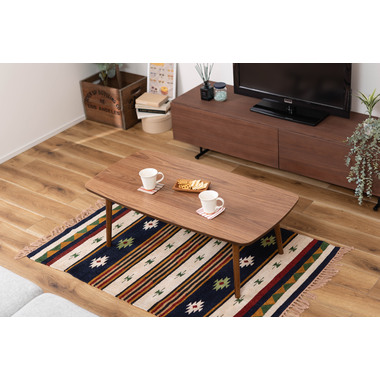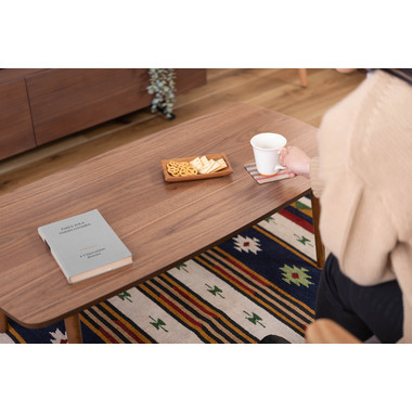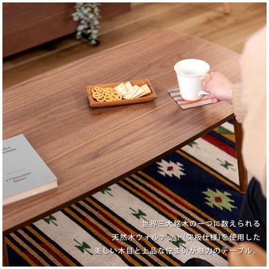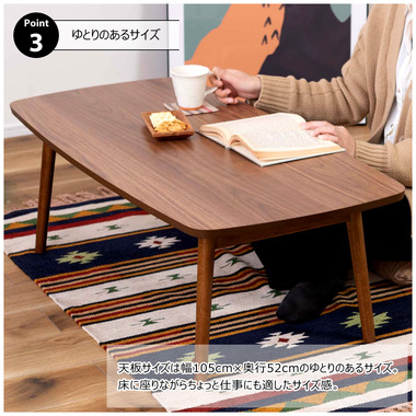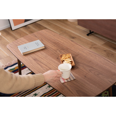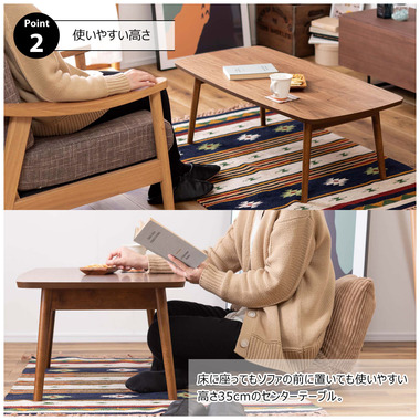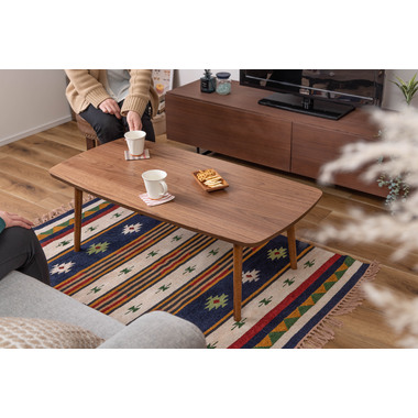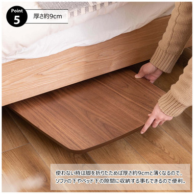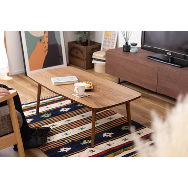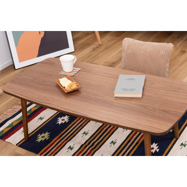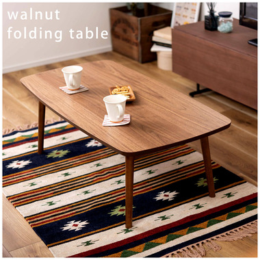 ●床に座っても、ソファの前に置いても使いやすい、高さ35cmのセンターテーブル。●天板には世界三大銘木の一つに数えられる天然木ウォルナット(突板)を使用。美しい木目と上品な佇まいが魅力。●天板サイズは幅105cm×奥行52cmのゆとりのあるサイズ。床に座りながらちょっと仕事にも適したサイズ感。●簡単に脚を折りたたむ事ができるフォールディングタイプ。脚の内側に付いているレバーを操作するだけの簡単仕様。●使わない時は脚を折りたためば厚さ約9cmと薄くなるので、ソファの下や隙間に収納する事もできるので便利。●天板はウレタン塗装を施してあるのでお手入れ簡単。●脚裏にはフェルト付き。