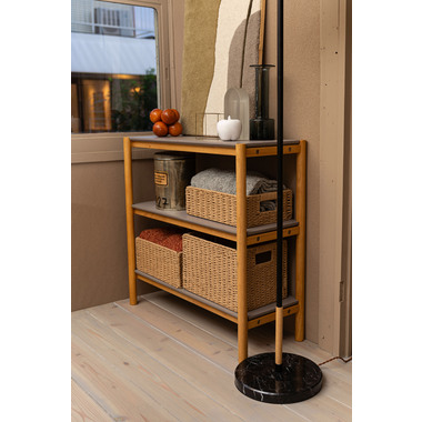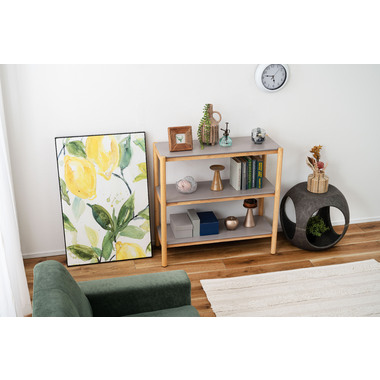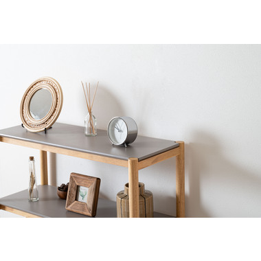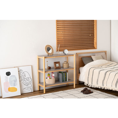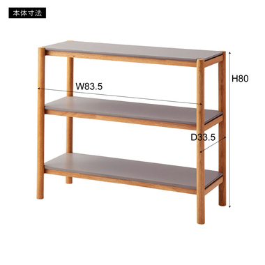 木目を活かしたナチュラルなフレーム部分と、絶妙なくすみグレーの棚板のコントラストがやさしい印象を与えてくれるシェルフです。