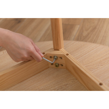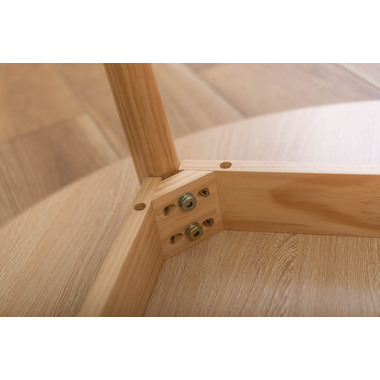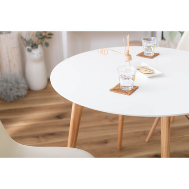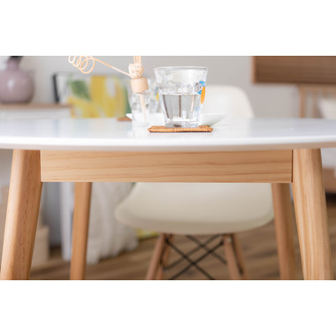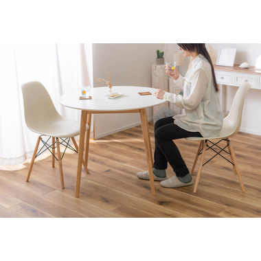 ●インテリア性の高い、コンパクトタイプのラウンドテーブル。●北欧風テイストの脚がハの字に広がるスッキリとしてデザインなので、どんな種類のチェアとも組み合わせやすいテーブル。●天板下の幕板は天板の反り止めや脚のグラつきを最大限抑え、テーブル全体に安定感を持たせてくれます。●ホワイト・ナチュラルどちらも、天板の表面は凹凸のない木目調仕上げ。●小口部分はデザイン性の高い船底形状。シャープですっきりとした印象なので、木製チェアからスチール素材を使ったチェアまで幅広く合わせられます。●脚裏にはフェルトが付いているので、床への傷防止にもなり安心です。