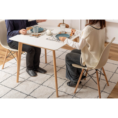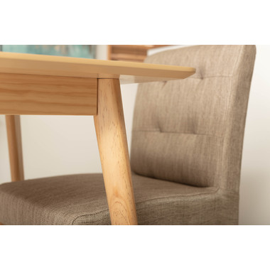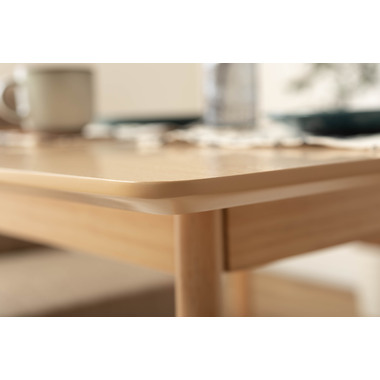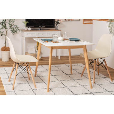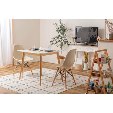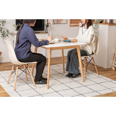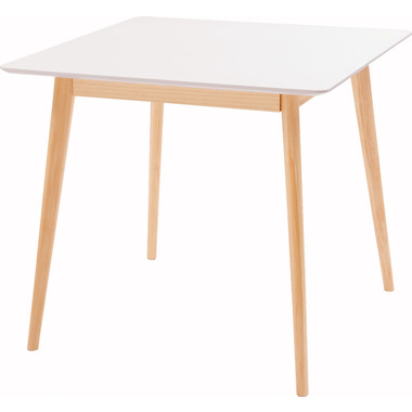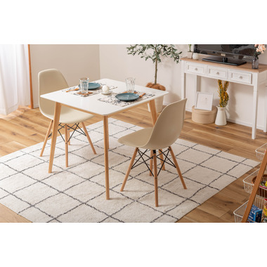 ●どんなインテリアにも合わせやすい、シンプルなスクエアテーブル。●省スペース向けのサイズながら、2人使いでもゆったりと食事ができる80角サイズ。●北欧風テイストの脚がハの字に広がるスッキリとしてデザインなので、どんな種類のチェアとも組み合わせやすいテーブル。●天板下の幕板は天板の反り止めや脚のグラつきを最大限抑え、テーブル全体に安定感を持たせてくれます。●ホワイト・ナチュラルどちらも、天板の表面は凹凸のない木目調仕上げ。●小口部分はデザイン性の高い船底形状。シャープですっきりとした印象なので、木製チェアからスチール素材を使ったチェアまで幅広く合わせられます。●脚裏にはフェルトが付いているので、床への傷防止にもなり安心です。