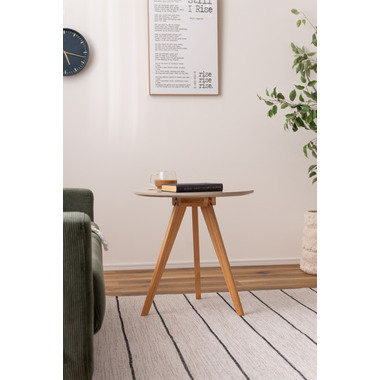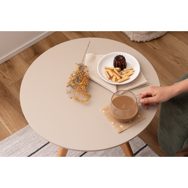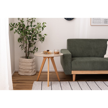●くすみカラーの天板と、天然木の三本脚が可愛らしさを存分に演出してくれるサイドテーブル。ソファやベッド横はもちろん、ちょっとしたディスプレイ台や、玄関先などにもオススメです。●ナチュラルな天然木の脚●簡単組み立て●持ち運びラクラク