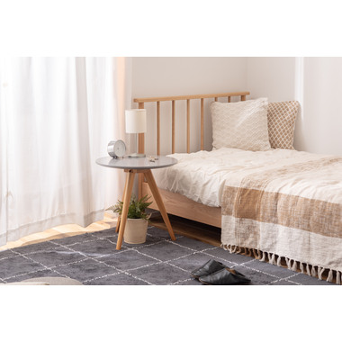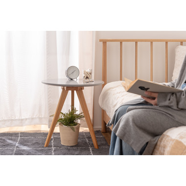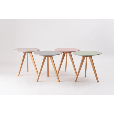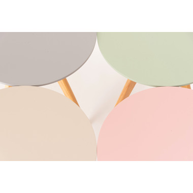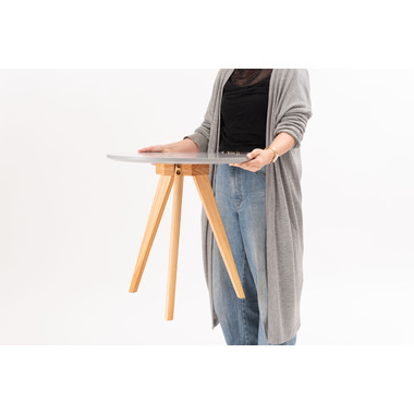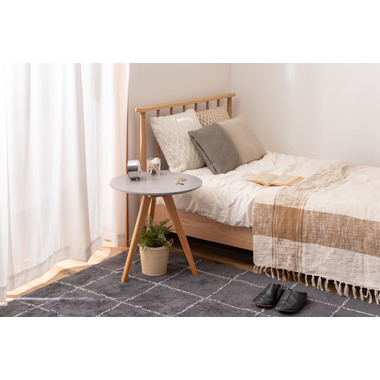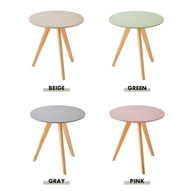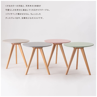 ●くすみカラーの天板と、天然木の三本脚が可愛らしさを存分に演出してくれるサイドテーブル。ソファやベッド横はもちろん、ちょっとしたディスプレイ台や、玄関先などにもオススメです。●ナチュラルな天然木の脚●簡単組み立て●持ち運びラクラク