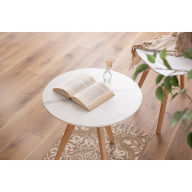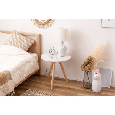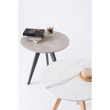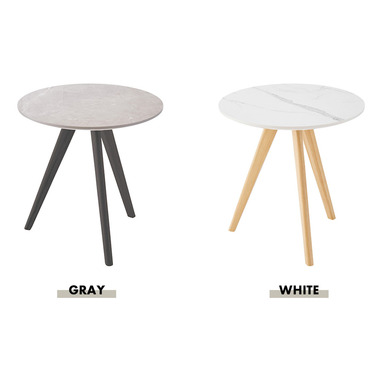 ●トレンドの大理石調デザインを施したサイドテーブル。●ソファやベッド横のテーブルはもちろん、小物などのディスプレイ台としてもおすすめ。●ソファ横に置けば、リラックスタイムのお供たちを手の届く範囲にセッティング出来ます。●ベッド横に置けば、就寝前のちょっとしたのんびり時間が捗ります。●天板は凹凸を抑えた大理石調のストーン柄。●トレンド感満載で、人気の韓国インテリアにもぴったり。●木目を活かした脚は、先が細いテーパードレッグ。●グレー天板にはダークグレー色の脚、ホワイト天板にはナチュラル色の脚を採用。●脚1本につきボルト2本を、付属六角レンチで留めるだけの簡単組立。●脚先には保護フェルトが付いているので、床への傷の心配がありません。