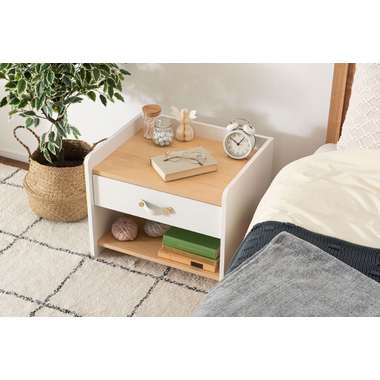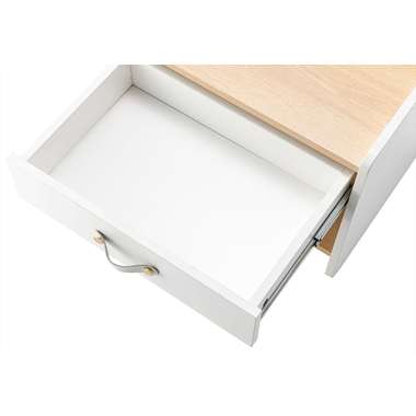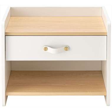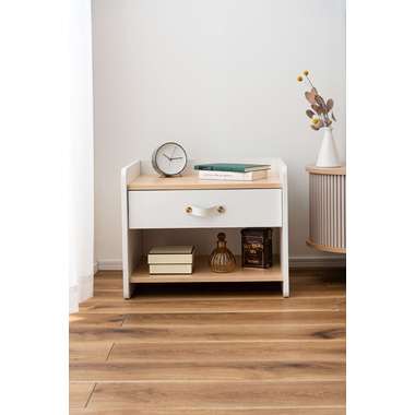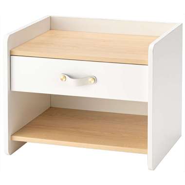 あたたかみのある木目調の天板と清潔感のあるホワイトを基調にした、北欧テイストのサイドチェスト。機能的で上品なレザー調の取っ手が付いた引き出しと、さっと取り出せるオープンシェルフを備え、デザイン性と使いやすさを両立しました。シンプルながらも洗練されたフォルムなので、ベッドサイドやリビングなど様々なシーンで活躍します。