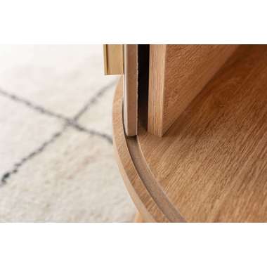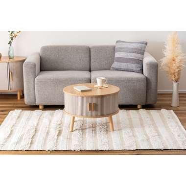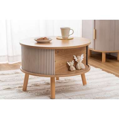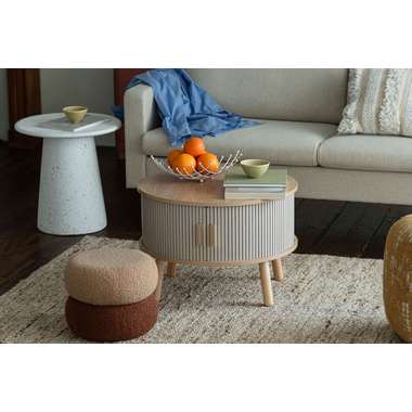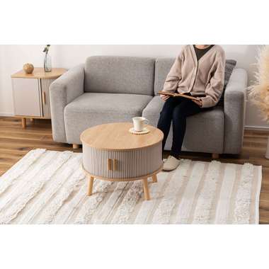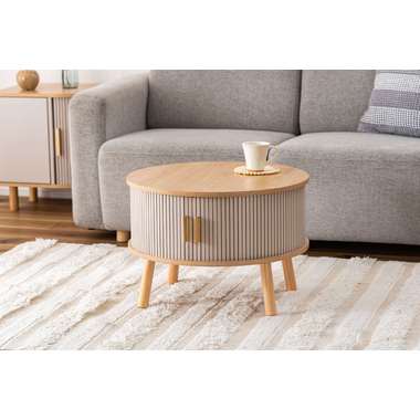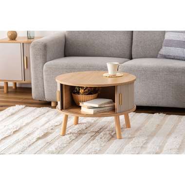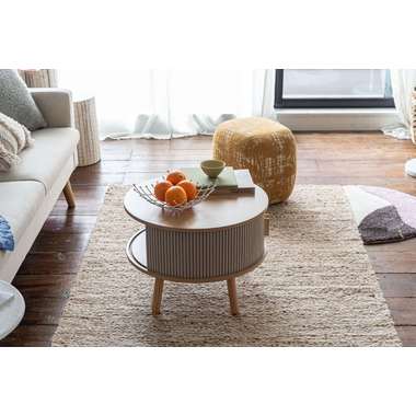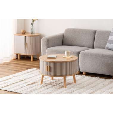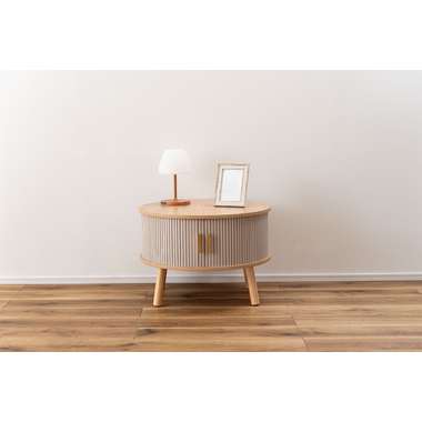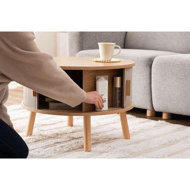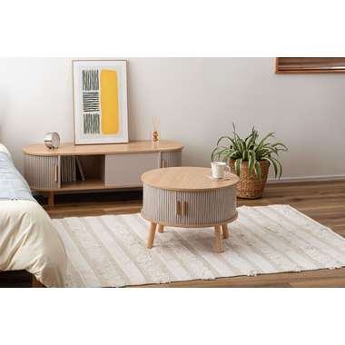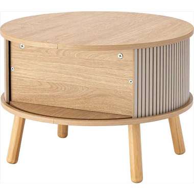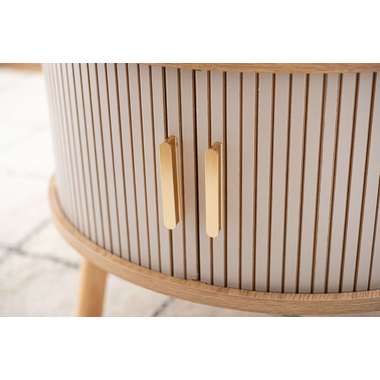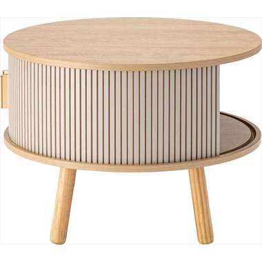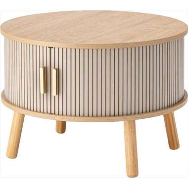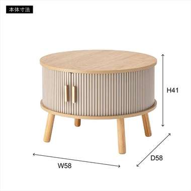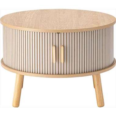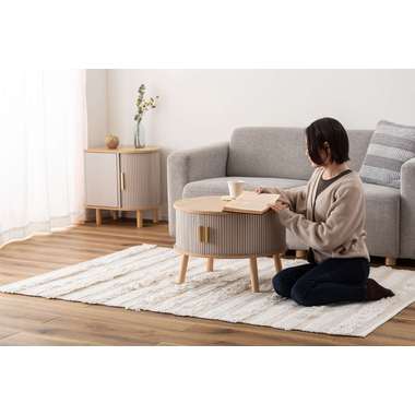 やわらかな丸みを帯びたフォルムが、空間にやさしい印象を与えるセンターテーブル。木目の風合いを活かした天板とリブ状のスライド扉を組み合わせ、シンプルで奥行きのある佇まいを演出。落ち着きのある淡いカラーにアンティークゴールドの取っ手をアクセントとして添え、ナチュラルさの中にほどよい上品さをプラス。控えめながらも特徴のあるデザインで、さまざまなインテリアになじみます。