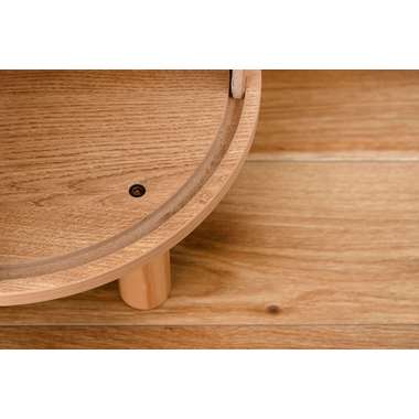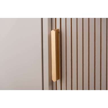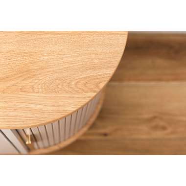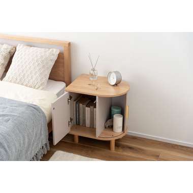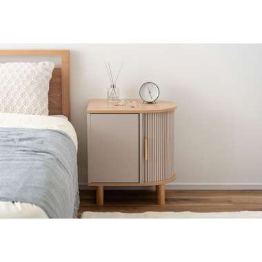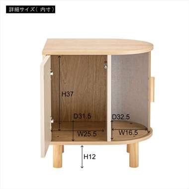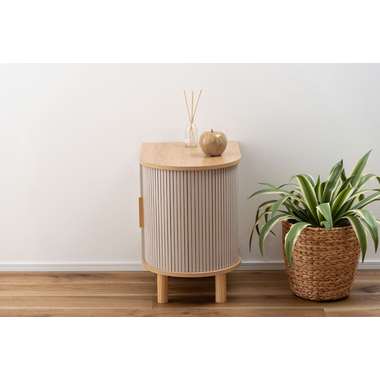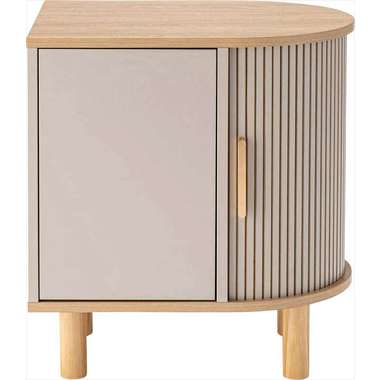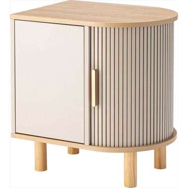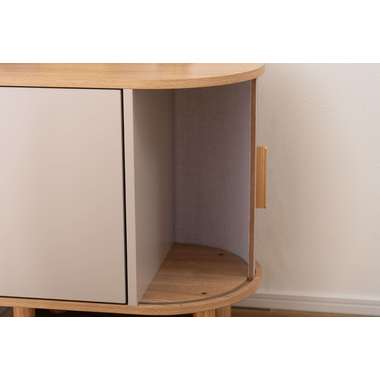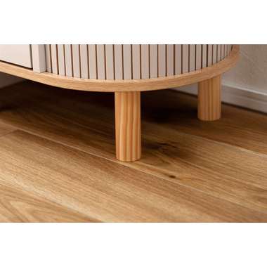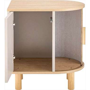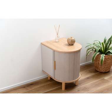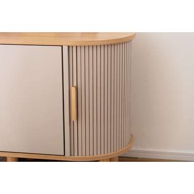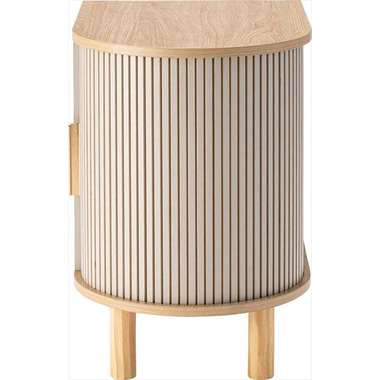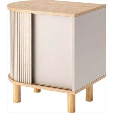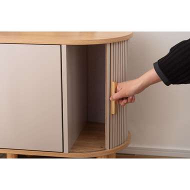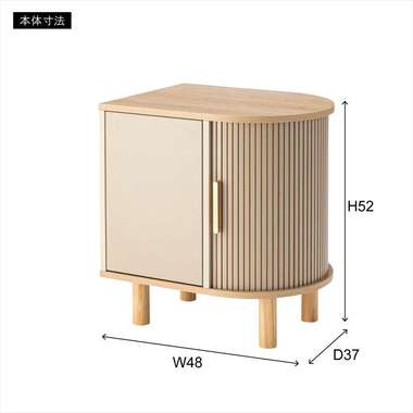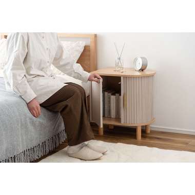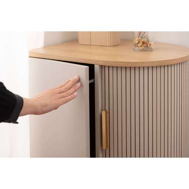 優雅なカーブを描くシルエットと、表情豊かなリブ状デザイン扉が印象的なサイドキャビネット。温もりを感じさせるナチュラルな木目調の風合いに、ニュアンスカラーとアンティークゴールドの取っ手が美しく、空間に華やかなアクセントを添えます。スマートなプッシュオープン式扉と特徴的な曲面に沿ったスライド扉、それぞれ異なる収納スペースを設け小物や本をスマートに収め、用途に合わせた使い分けができます。