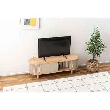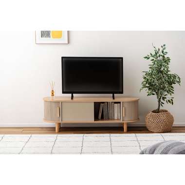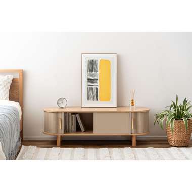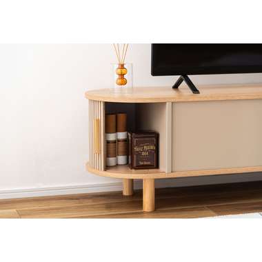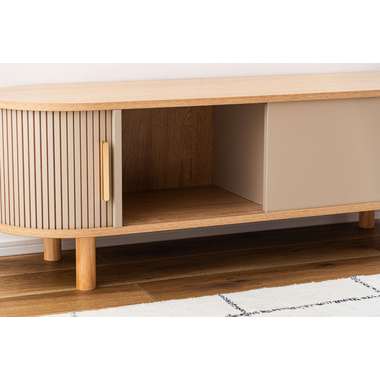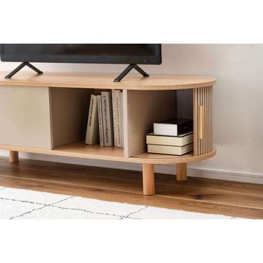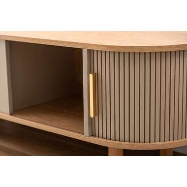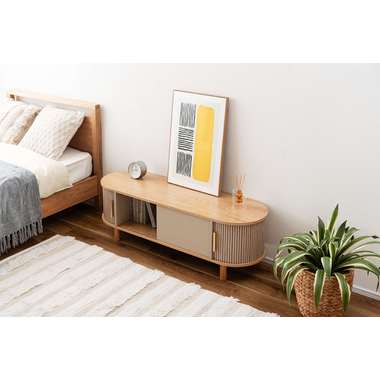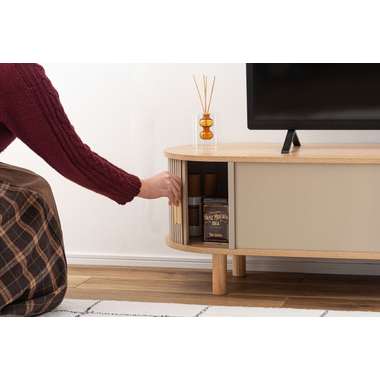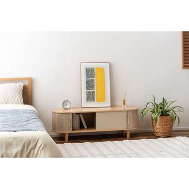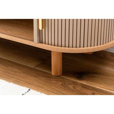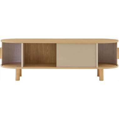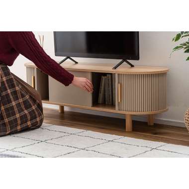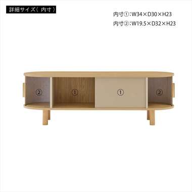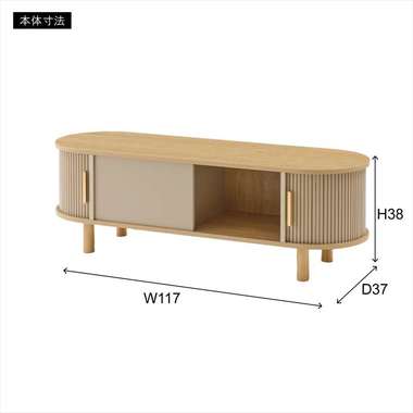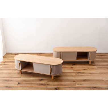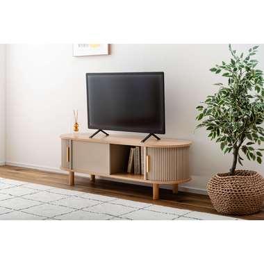 丸みを帯びたフォルムに、陰影が美しいデザインを施した、上品なローボード。ナチュラルな木目と落ち着いたニュアンスカラーが調和し、様々なテイストになじみます。中央の収約スペースは、スライド扉を左右に動かし、「見せる収納」と「隠す収納」に使い分けることができます。中身をすっきりと隠せるサイドの収納と、お気に入りの小物を飾れる空間を自分好みに使いながら、開放感のある心地よい空間を演出してくれます。