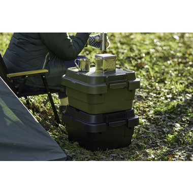 トレー型でフラット形状のフタがテーブルとしても使え、積み重ねたときのズレも防止できる仕様となっております。