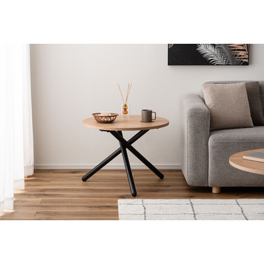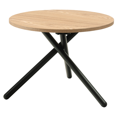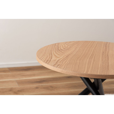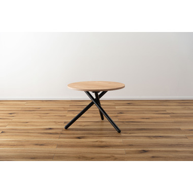 ●クロスした3本のブラックスチール脚がスタイリッシュなラウンドテーブル。