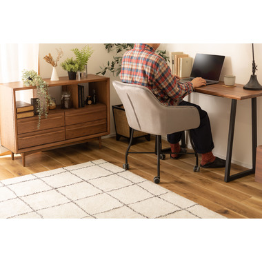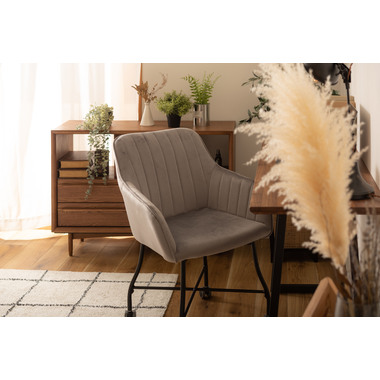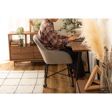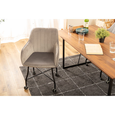 ●ベロアの上質な質感と脚のなめらかなカーブが美しいチェア。●キャスター付きで着座、離席時の動きがスムーズ。使い心地抜群。●触感の良い生地で、カーブの付いた背とアームが身体になじみ寛げます。●デスクやダイニングはもちろん、ミーティングスペースや、フリースペース、休憩スペースでもおすすめ。