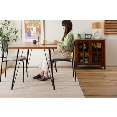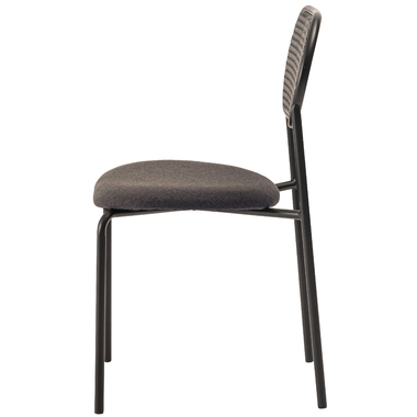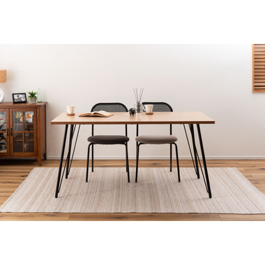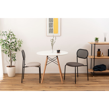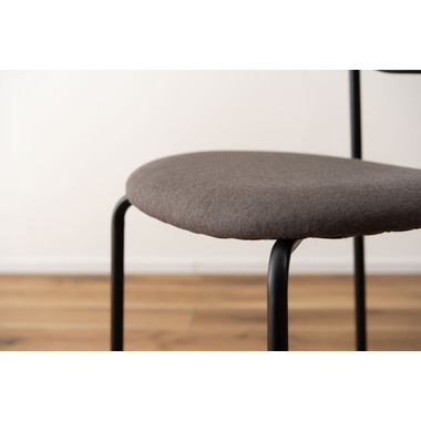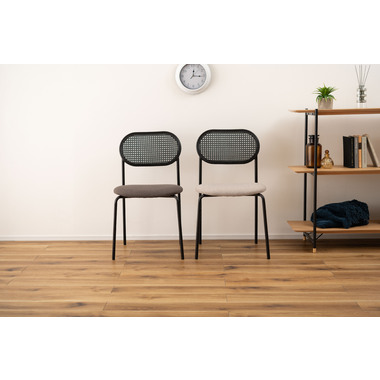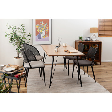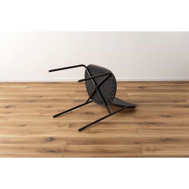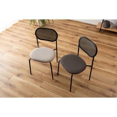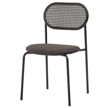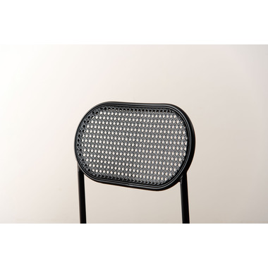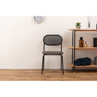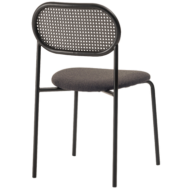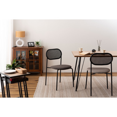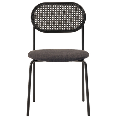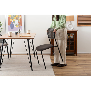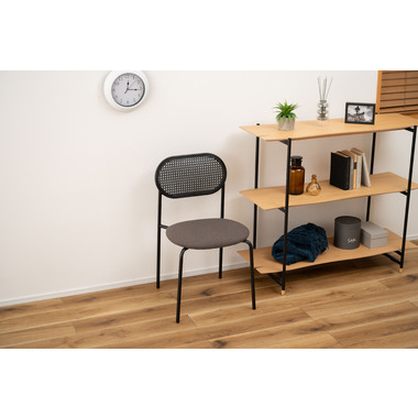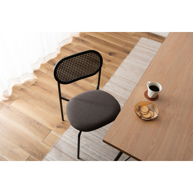 ラタン調×ブラックスチールのスタイリッシュなデザイン シンプルながら目を引くかごめ編み調デザインを施した背面と、艶を抑えたブラックスチールの組み合わせがモダンなチェア。座面には落ち着いた、モノトーンカラーのファブリックを採用。締まった脚部がシャープな印象を与え、空間に上品さを加えます。