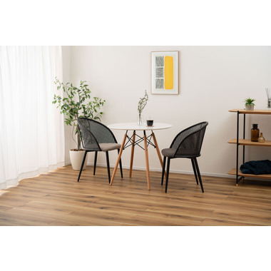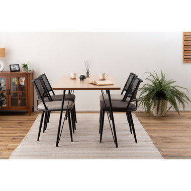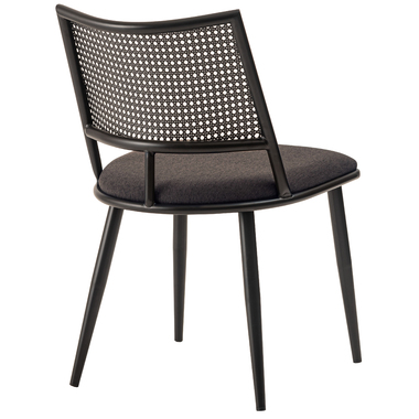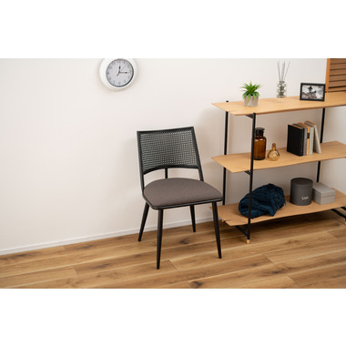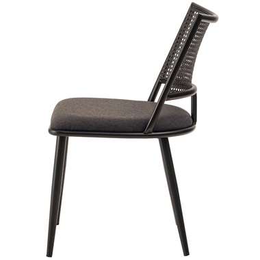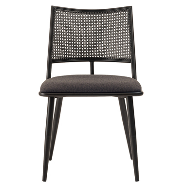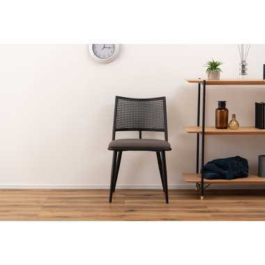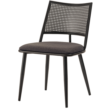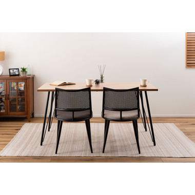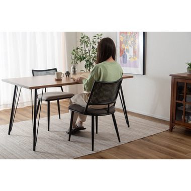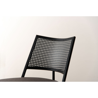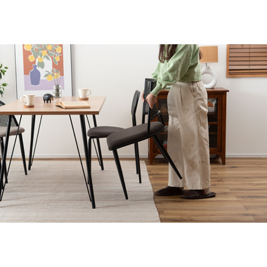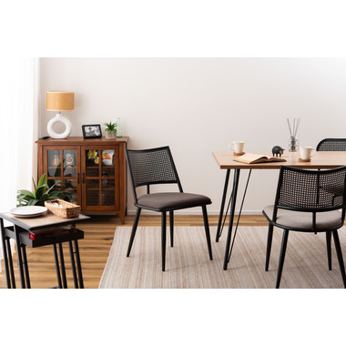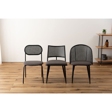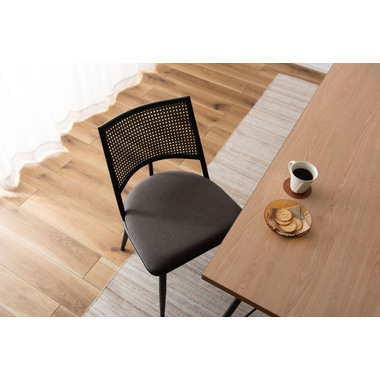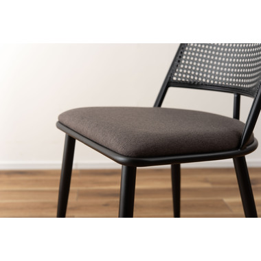 ラタン調×ブラックスチールのスタイリッシュなデザイン シンプルながら目を引くかごめ編み調デザインを施した背面と、艶を抑えたブラックスチールの組み合わせがモダンなチェア。座面には落ち着いた、モノトーンカラーのファブリックを採用。締まった脚部がシャープな印象を与え、空間に上品さを加えます。