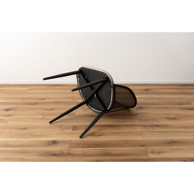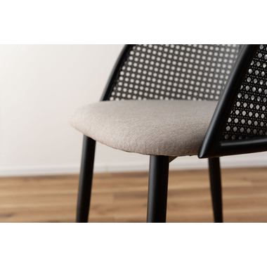 ラタン調×ブラックスチールのスタイリッシュなデザイン シンプルながら目を引くかごめ編み調デザインを施した背面と、艶を抑えたブラックスチールの組み合わせがモダンなチェア。座面には落ち着いた、モノトーンカラーのファブリックを採用。締まった脚部がシャープな印象を与え、空間に上品さを加えます。