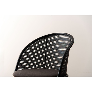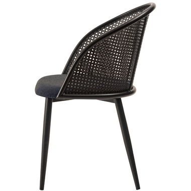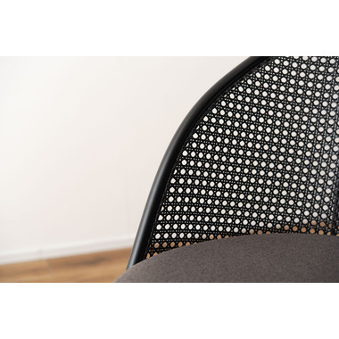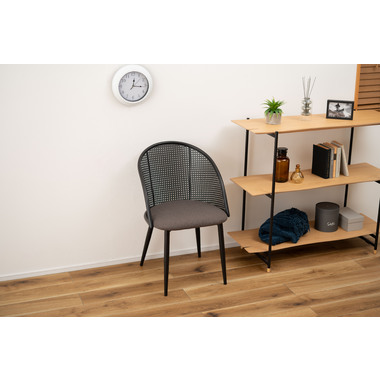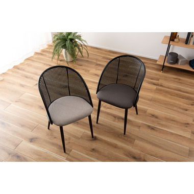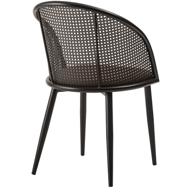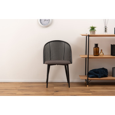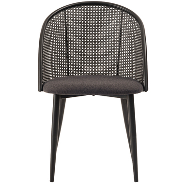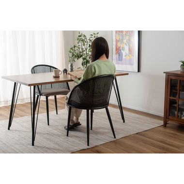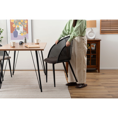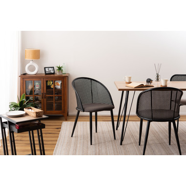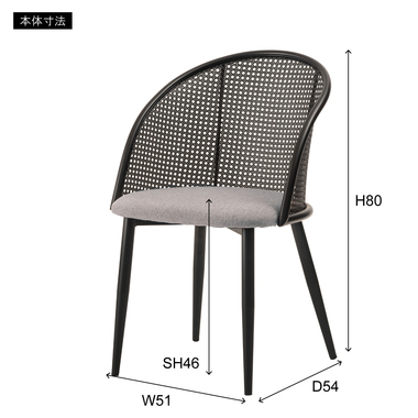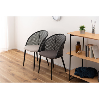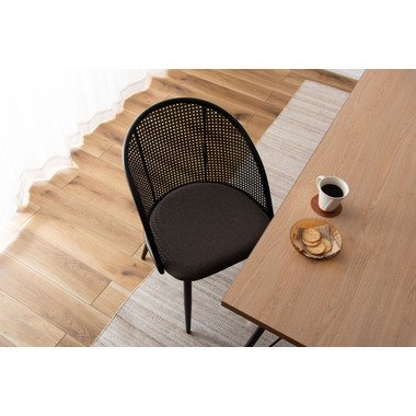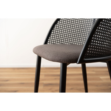 ラタン調×ブラックスチールのスタイリッシュなデザイン シンプルながら目を引くかごめ編み調デザインを施した背面と、艶を抑えたブラックスチールの組み合わせがモダンなチェア。座面には落ち着いた、モノトーンカラーのファブリックを採用。締まった脚部がシャープな印象を与え、空間に上品さを加えます。