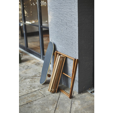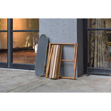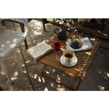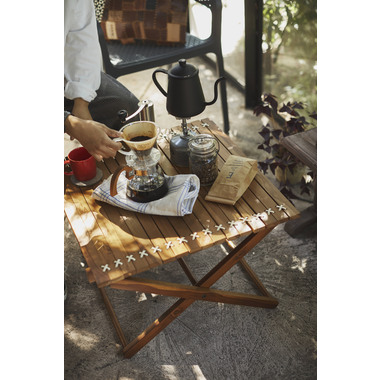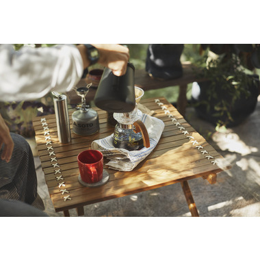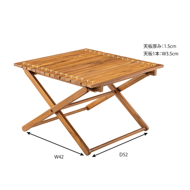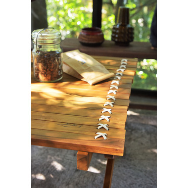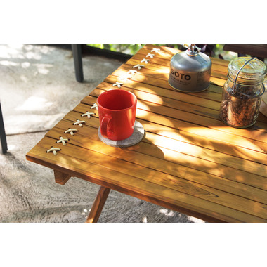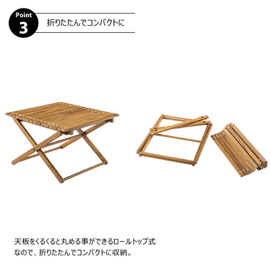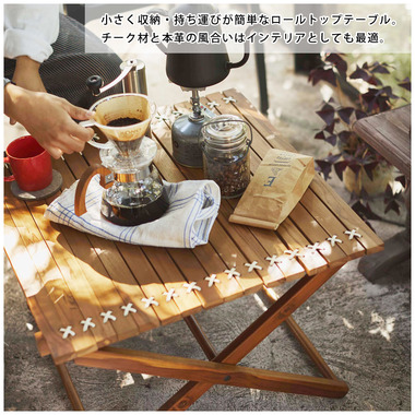 ●小さく収納・持ち運びが簡単なロールトップテーブル。チーク材と本革の風合いはインテリアとしても最適。