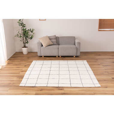 ●どんなインテリアにも合わせやすいシンプルなラグ。●飽きのこないデザインと大きめのサイズでリビングとの相性もばっちりです。●保温力と通気性を兼ね備えたコットン素材を使用しており、オールシーズンで使うことができます。●冬シーズンはコタツの下に敷いてコタツ用ラグとしても使えます。