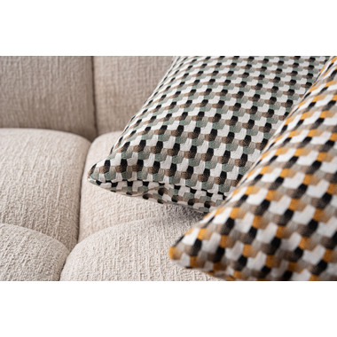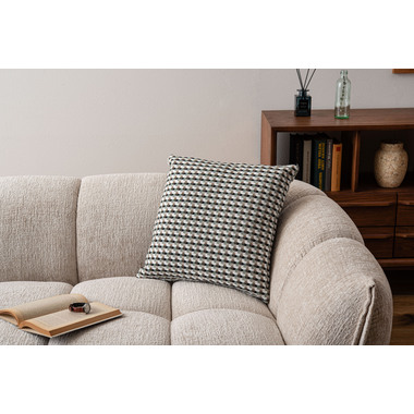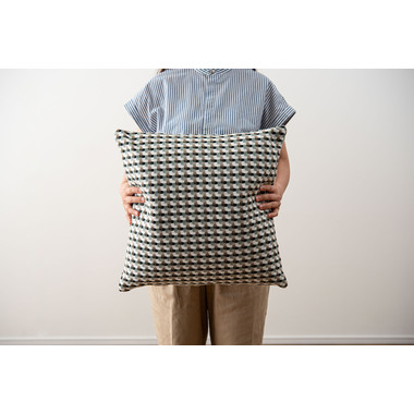 ●優しい色味で幾何学柄のデザインが魅力的なクッション。